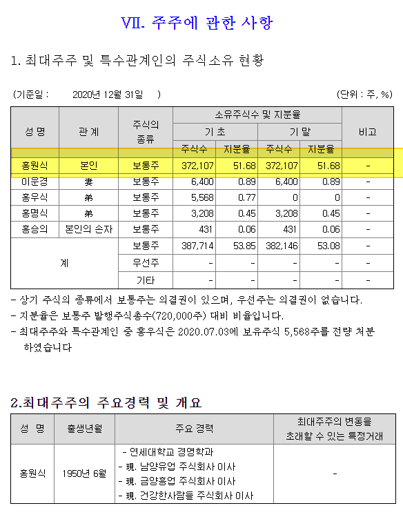 홍원식 회장을 보자, 372,107주로 51.7%의 지분을 보유한 실질적인 경영자이자 남양유업 소유주다.