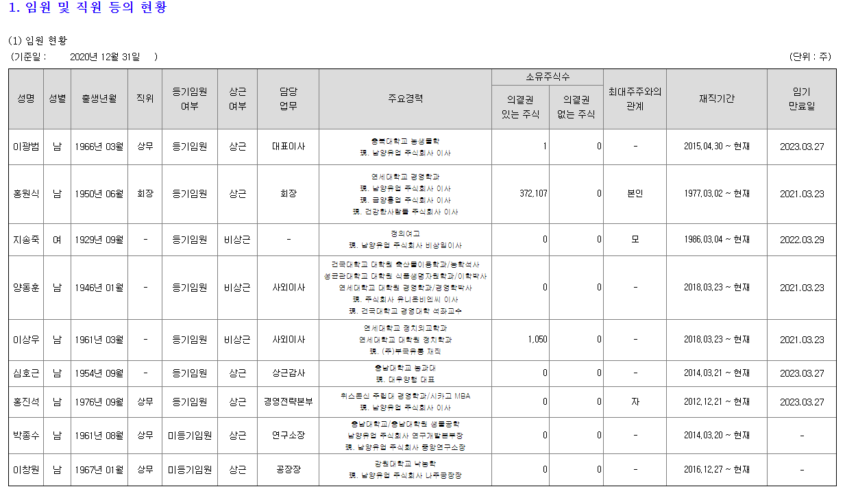 남양유업 2020년 사업보고서를 보면, 임직원 및 주주관련 내용이 있다.