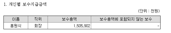 홍 회장은 2020년에 회장 보수로 15억을 넘게 보수로 받았다.