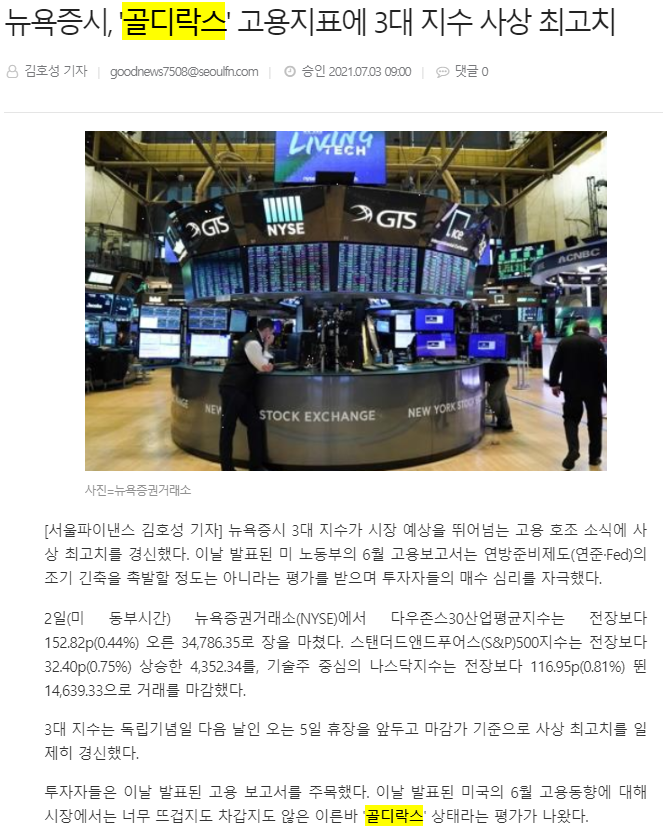 최근 미국 증시가 사상 최고치를 경신을 계속하여 골디락스 경제라는 말이 지속 나오고 있다.