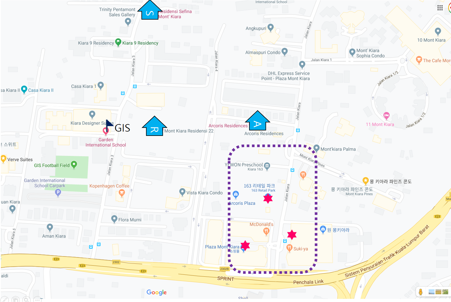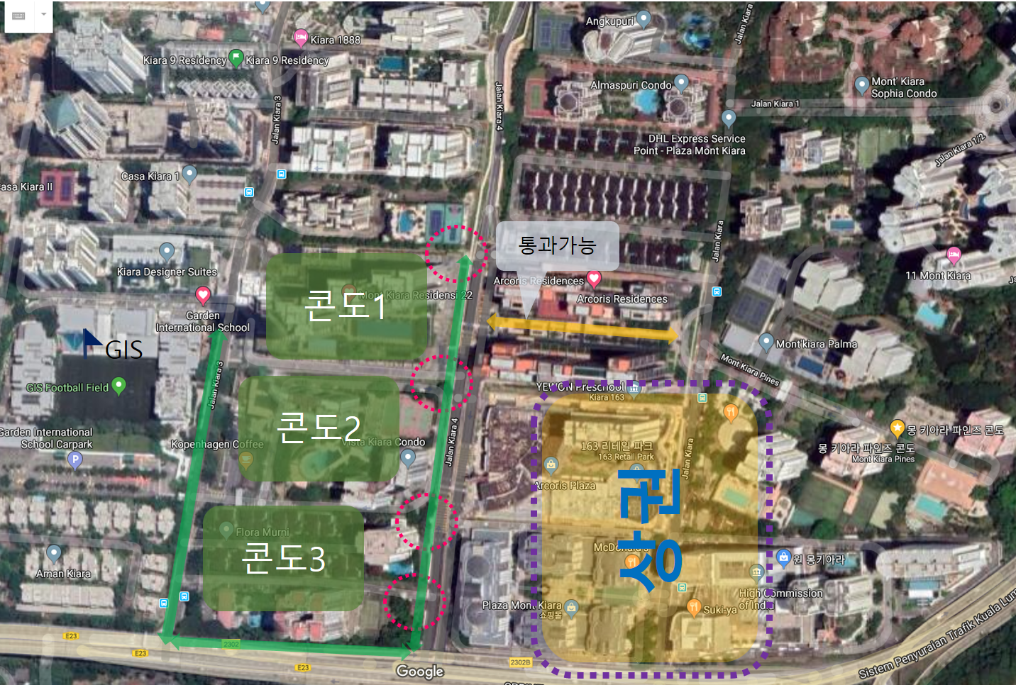 위 사진에서 몽키아라 상권이 있는 지역을 보시면, 163몰과 Plaza Mont Kiara, 1 One Mont Kiara로 이어지는 상권에 대한 접근성이 중요한데요. 레지던시22의 East Main Entrance가 Acoris 반대편 입구랑 이어지면서 상권 접근성이 좋구요. West Main Entrace는 도로를 건너면 GIS학교 입구로 바로 향하게 됩니다.