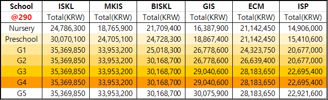 3) 각 학년별로 Application Fee, Admission Fee가 포함되어, 학년을 올라갈때는 위금액의 80%만 반영하시면되요.
