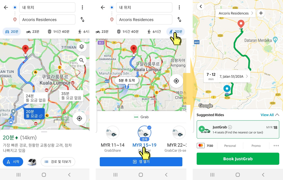 2) Google App으로 목적지 찾고 Grab앱으로 연동하여 택시 잡는 방법
